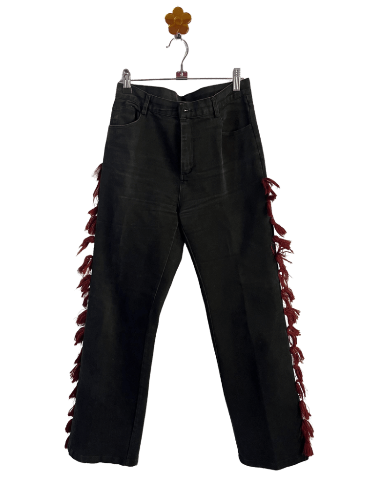 Pantalón negro con detalles de flecos rojos, único y original.