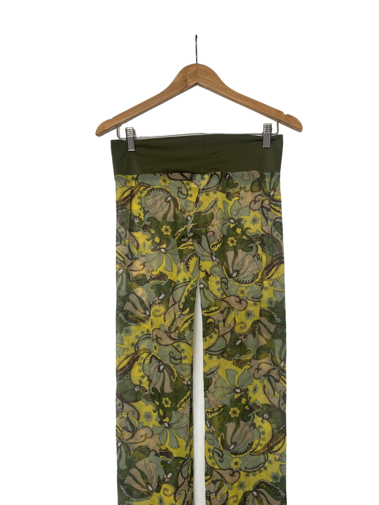 Pantalón de playa de Guru en tonos verde y amarillo, ligero y colorido, ideal para días de verano o vacaciones en la playa.